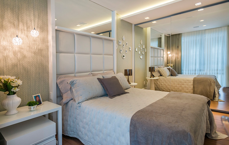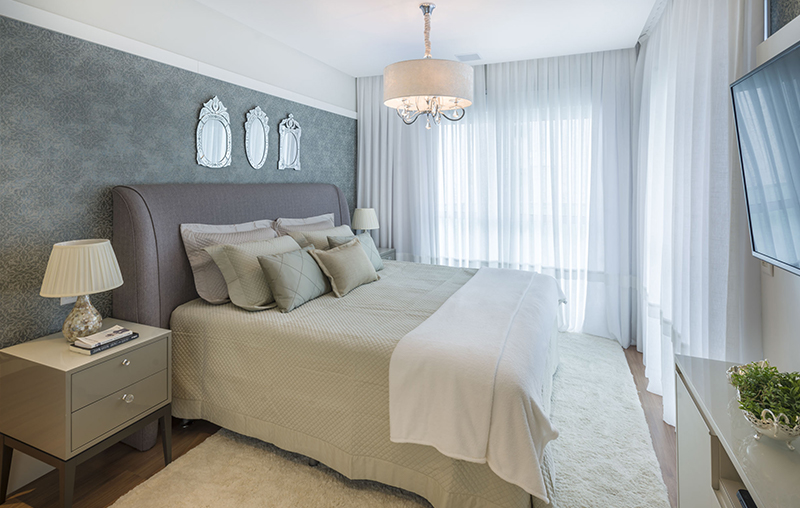 Mobiliário em laca acetinada e brilhante, trazendo o toque aveludado às peças. Parte da Cozinha possui a opção de ser fechada com portas de correr em vidro extra clear, deixando o ambiente mais confortável. A mesa de jantar em laca alto brilho possui acabamento chanfrado, tendo o apoio de um aparador central em lâmina natural. Os armários com portas em espelho criam a sensação de amplitude aos ambientes e os tons suaves do mobiliário trazem leveza ao apartamento.